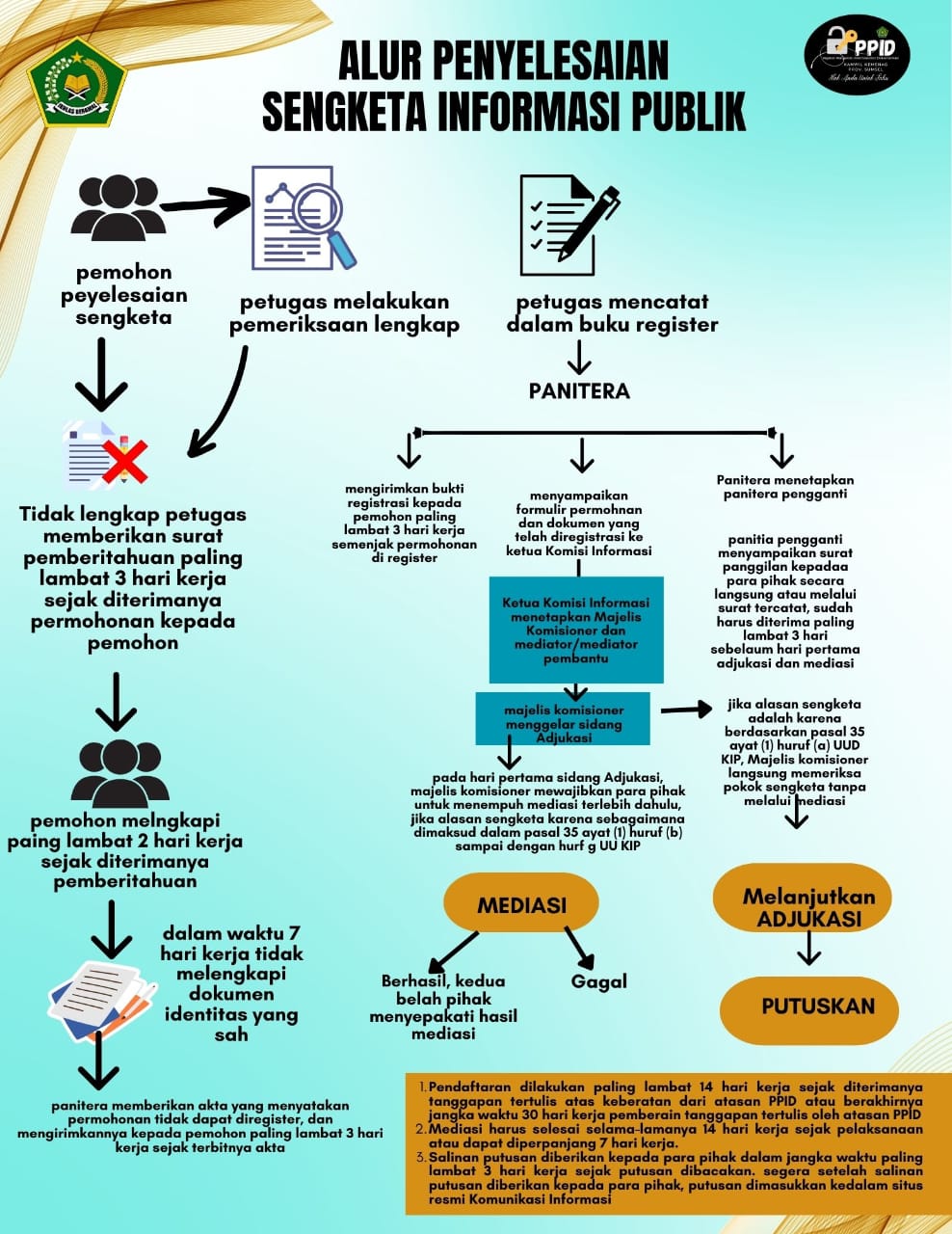 Pemohon Informasi Publik dapat mengajukan permohonan penyelesaian Sengketa Informasi Informasi Publik kepada Komisi Informasi, apabila tidak mendapat tanggapan atas keberatan dan/atau tanggapan atas keberatan tidak memuaskan Pemohon Informasi Publik. Permohonan diajukan ke Komisi Informasi dalam waktu paling lambat 14 (empat belas) hari kerja setelah diterimanya tanggapan dari Atasan PPID dan/atau sejak jangka waktu pemberian tanggapan berakhir.