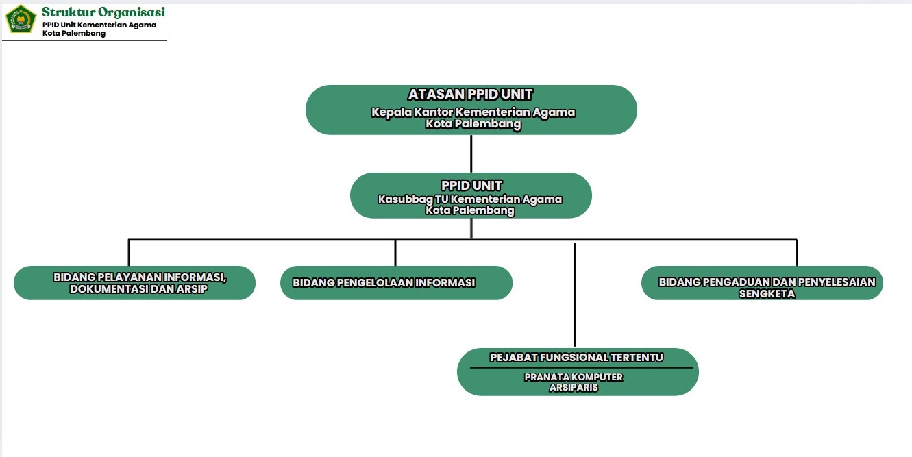 PPID ini di Kelola Oleh Kepala Sub Bagian Tata Usaha dan Kepala Kantor sebagai atasan PPID. Untuk tingkat madrasah negeri,yang meliputi Madrasah Ibtidaiyah Negeri (MIN), Madrasah Tsanawiyah Negeri (MTsN), dan Madrasah Aliyah Negeri (MAN) serta Kantor Urusan Agama (KUA) tidak dibentuk PPID. Dalam hal ini, seluruh pelayanan informasi publik dilakukan di Kantor Kementerian Agama Kota Palembang.