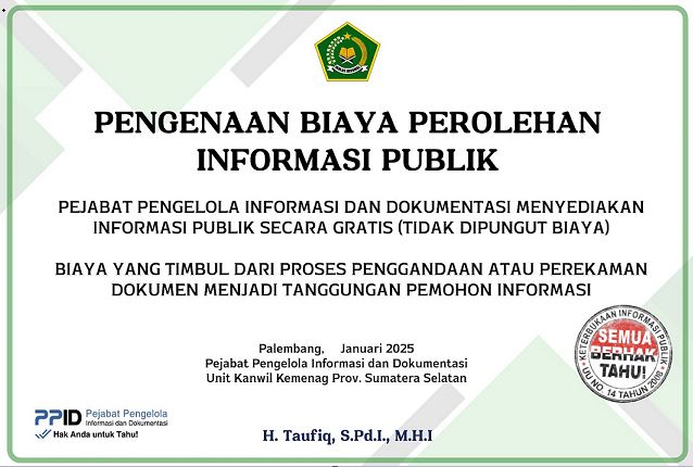 Dalam hal ini PPID Unit Kanwil Kemenag Sumsel menetapkan Standar Biaya Pelaksanaan PPID sebagai berikut: